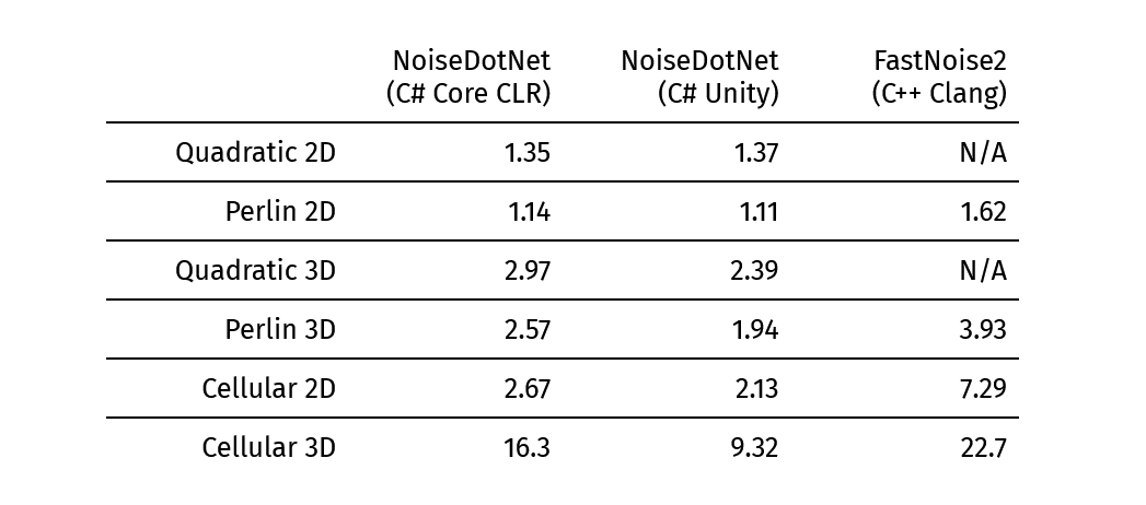 If you’d like to use Quadratic noise, I just published NoiseDotNet, an open-source C# library with extremely optimized implementations of Quadratic and Cellular noise in 2D and 3D. Here is a performance comparison with the excellent C++ library FastNoise2: